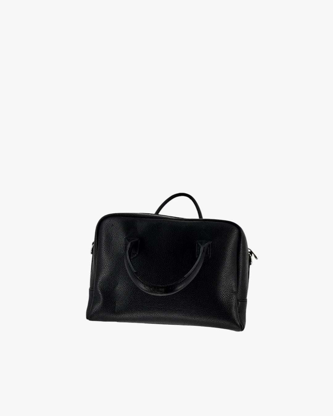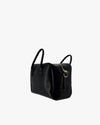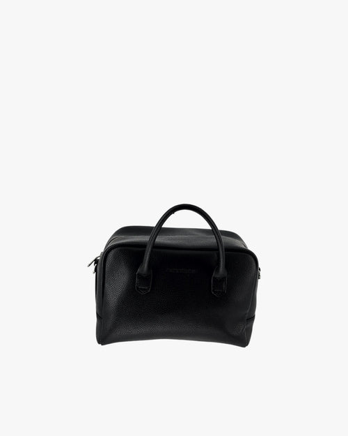 Classic black leather bowling-style bag with a structured yet soft silhouette. Practical, spacious, and timeless.
