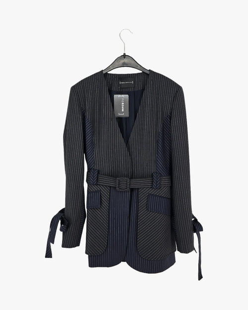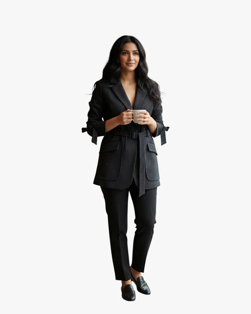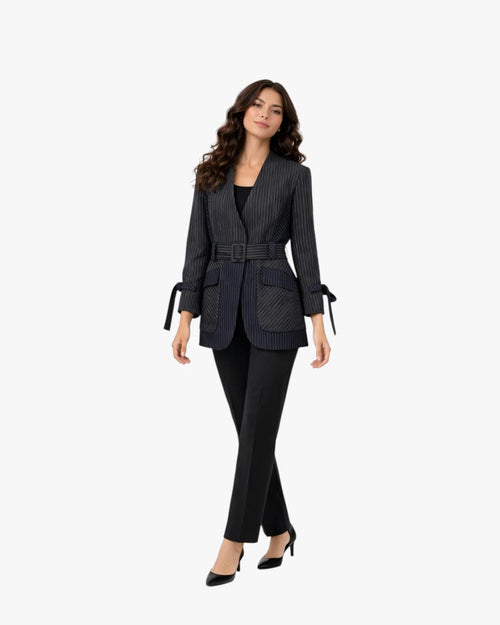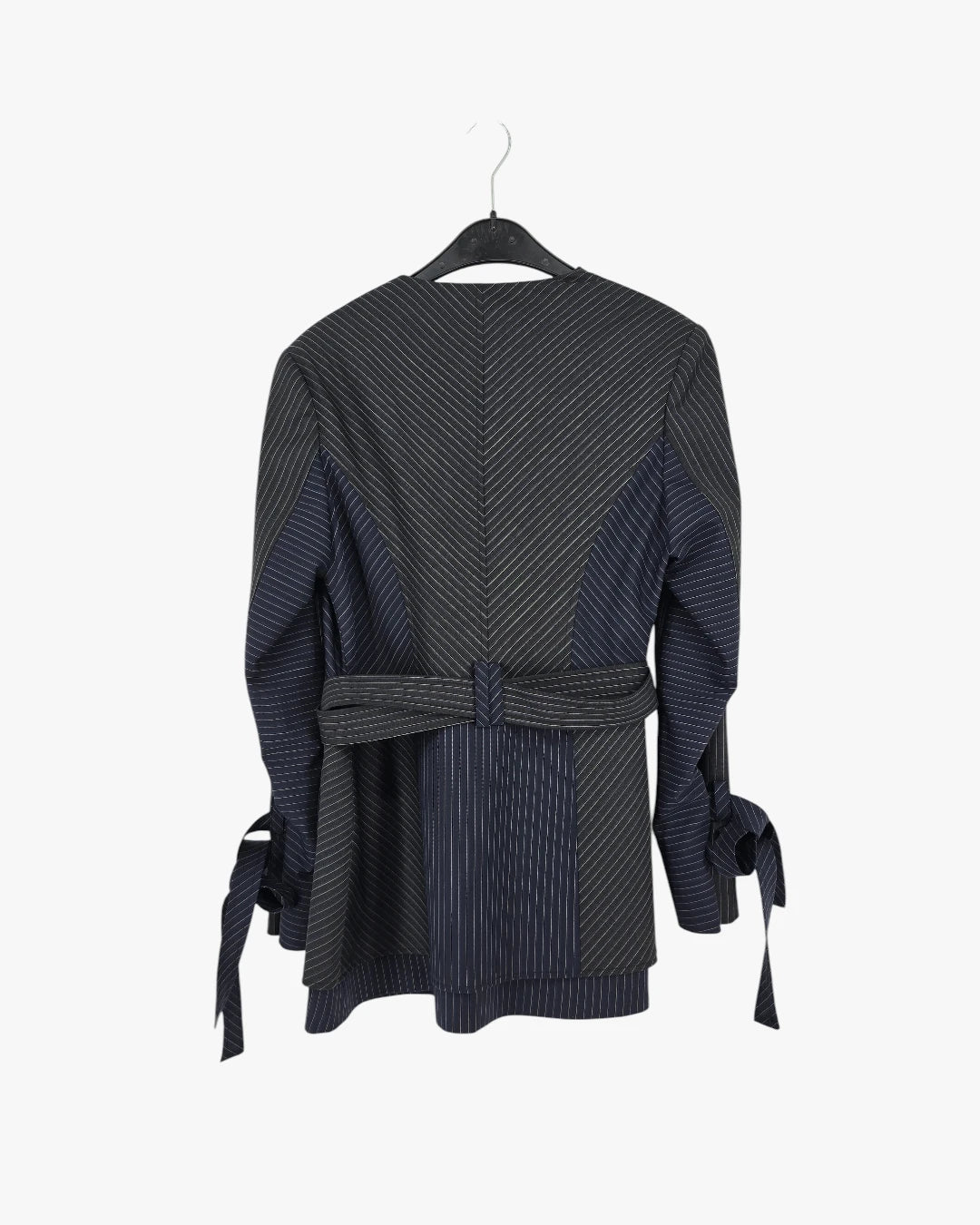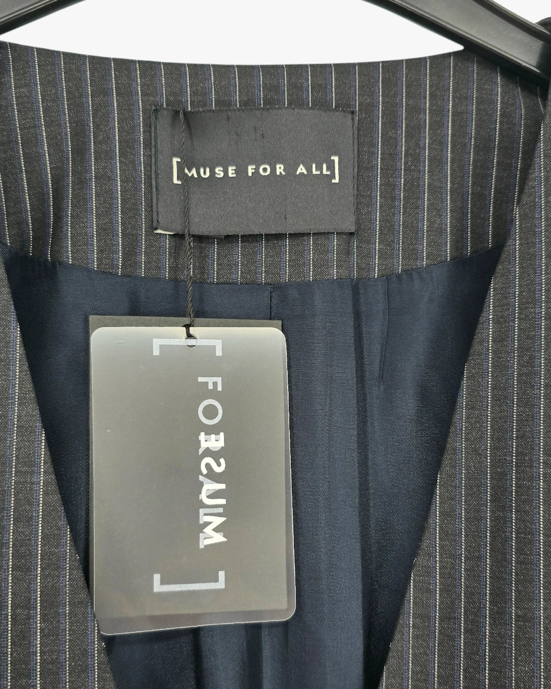 A tailored jacket with a modern silhouette and subtle pinstripe detailing. Elegant, confident, and ideal for polished looks. Fits sizes Medium & Large.