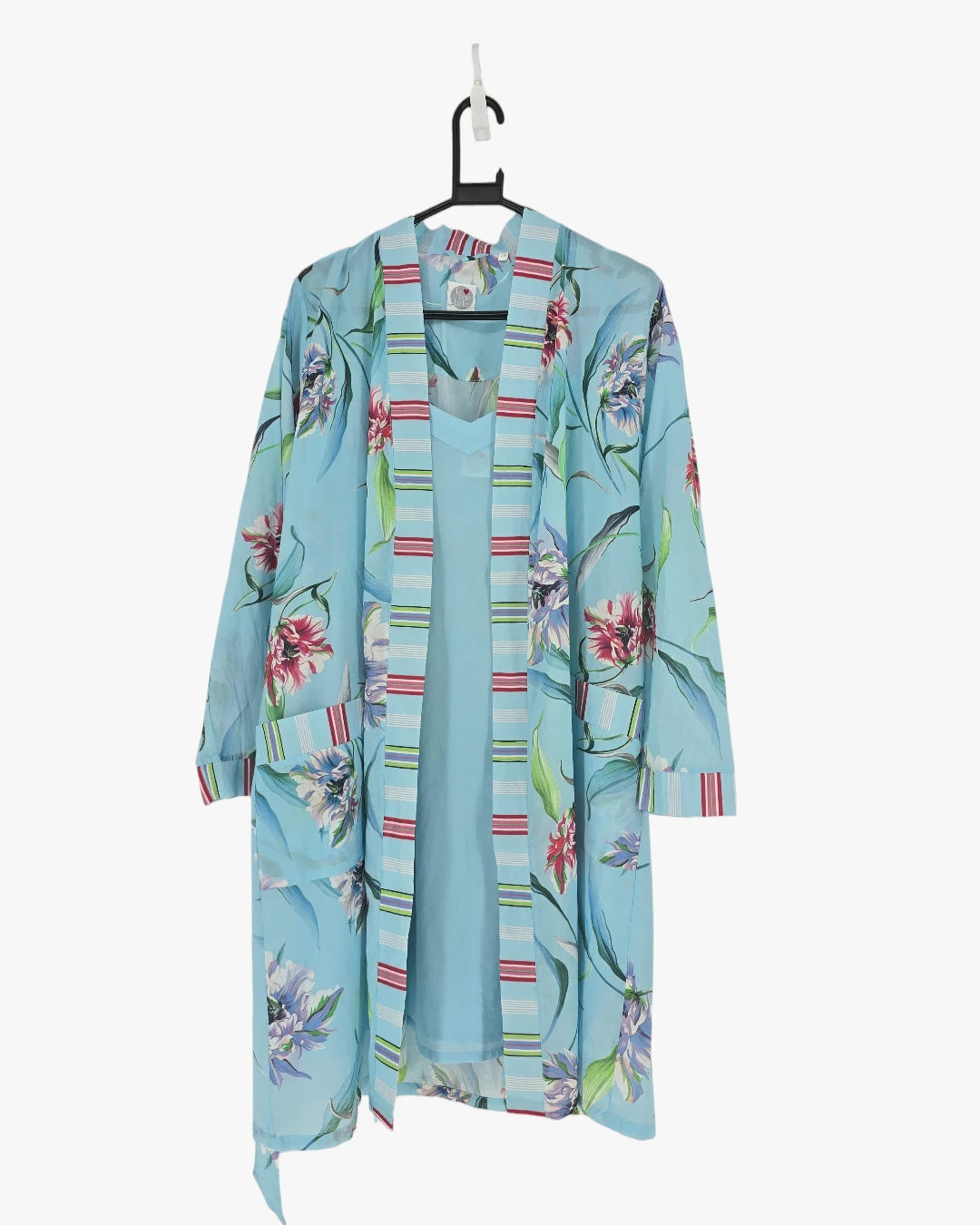 A light and refreshing sleepwear set that feels calm and effortless. The soft blue dress paired with its patterned robe creates a relaxed, graceful lookÑeasy to wear and soothing from evening through morning.