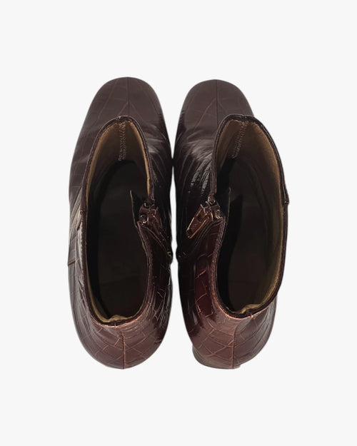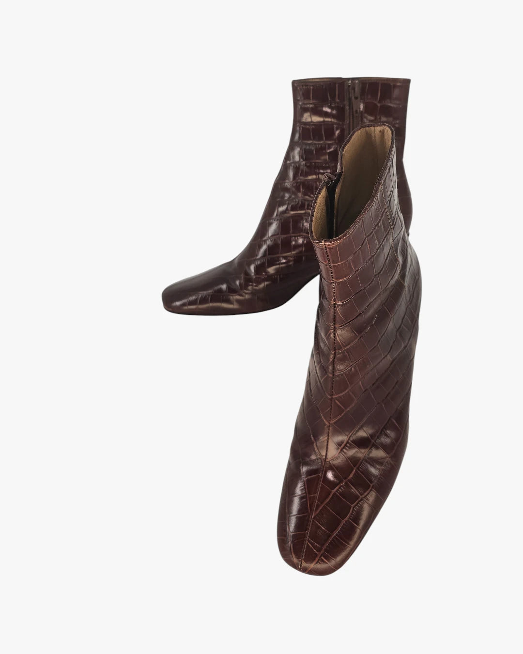 Ankle-length leather boots, crocodile-embossed texture, smooth almond toe, structured silhouette, side opening for easy wear. Size 38