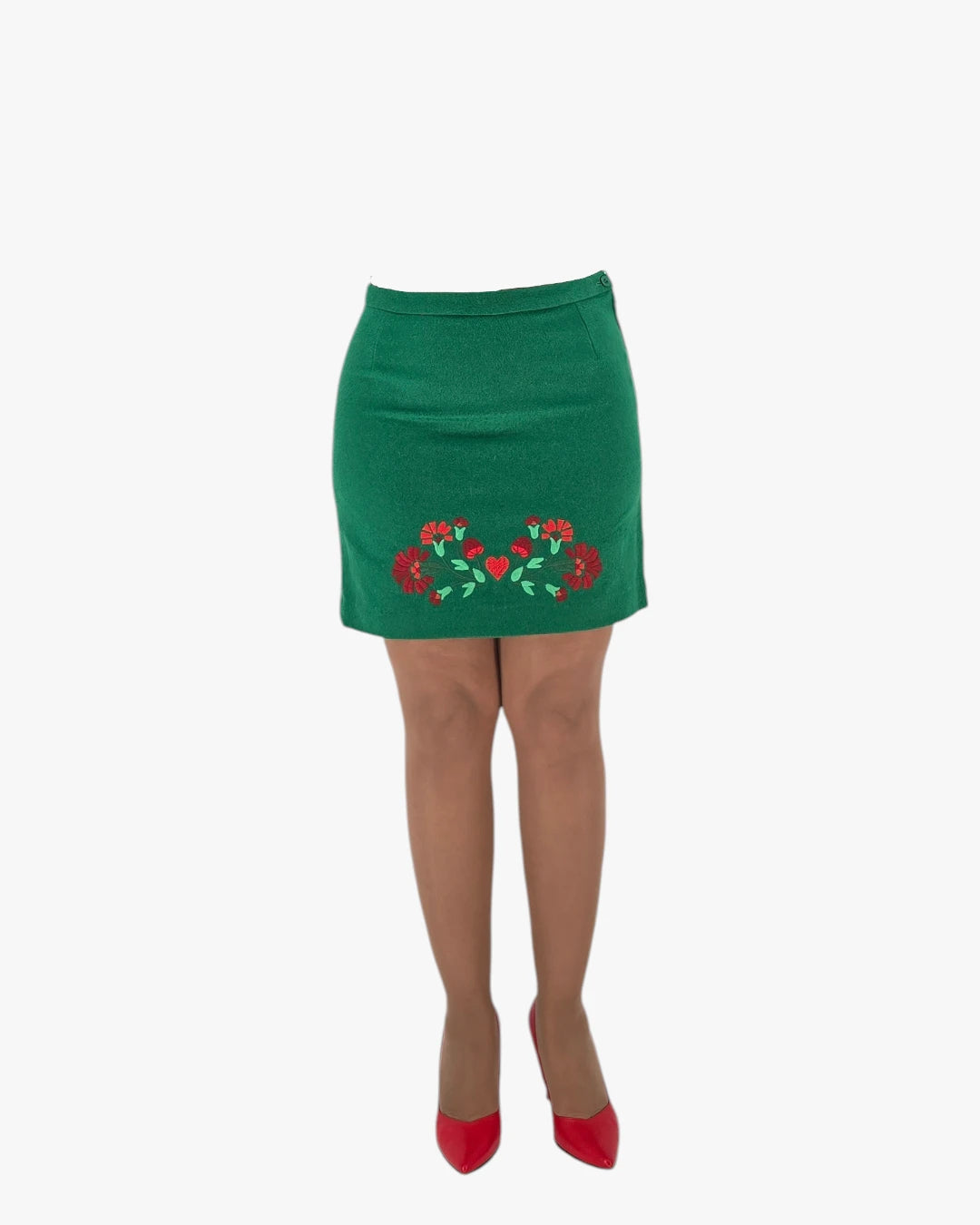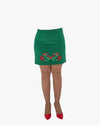 Elegant green mini skirt accented with delicate floral embroidery, bringing a playful yet refined touch to a classic shape.