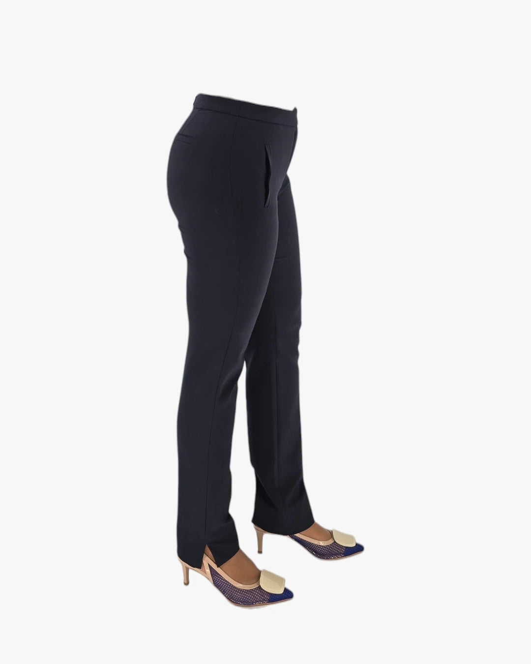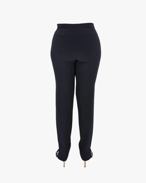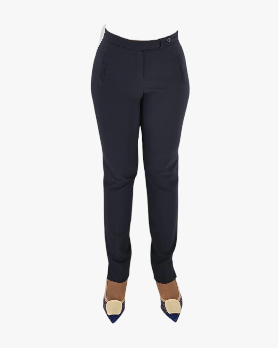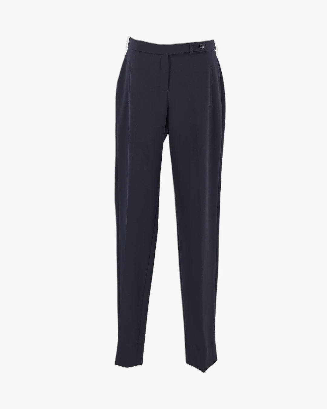 Designed in deep navy, this piece offers understated elegance and versatility. The clean tailoring and subtle pleating create a sharp, elongated line Ñ ideal for both office refinement and elevated casual styling. Fits medium size