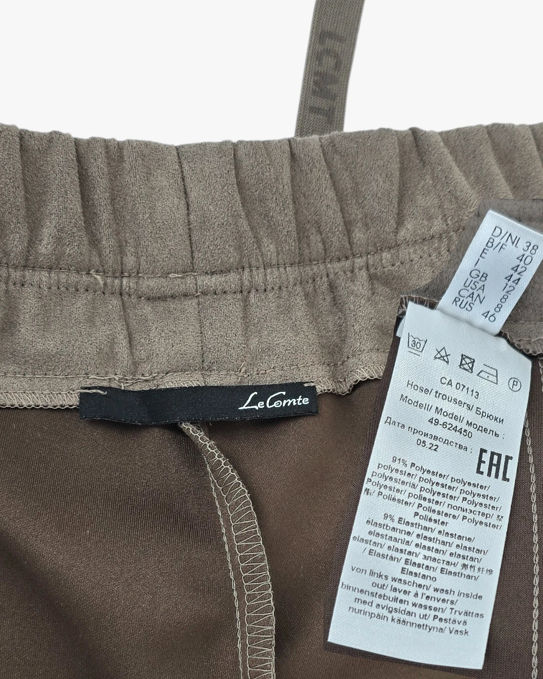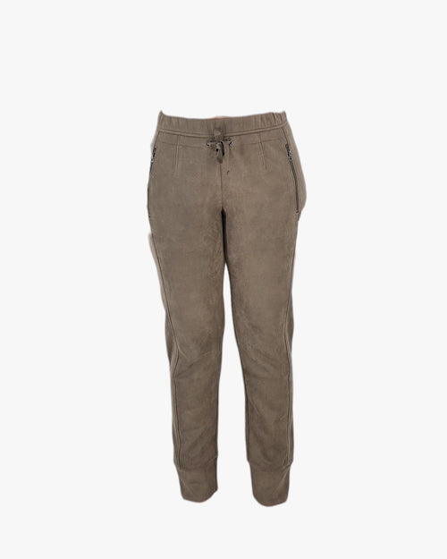 Designed in a warm taupe tone, this piece blends comfort and sophistication. The elastic waistband with drawstring and zip details add subtle edge, while the tapered cut keeps it polished. A chic elevated casual essential. Fits medium size.