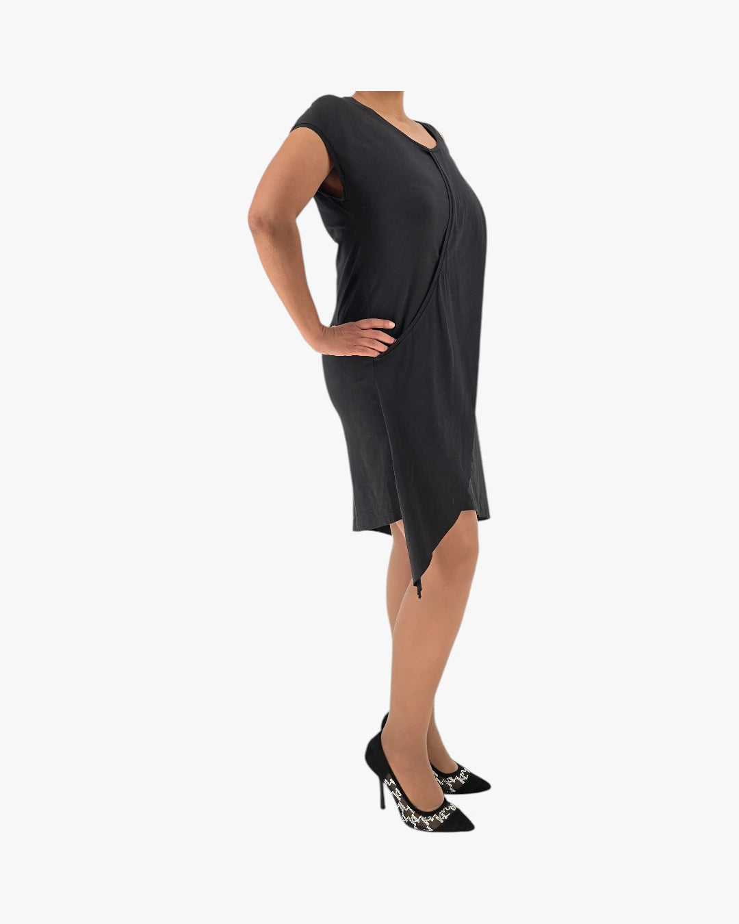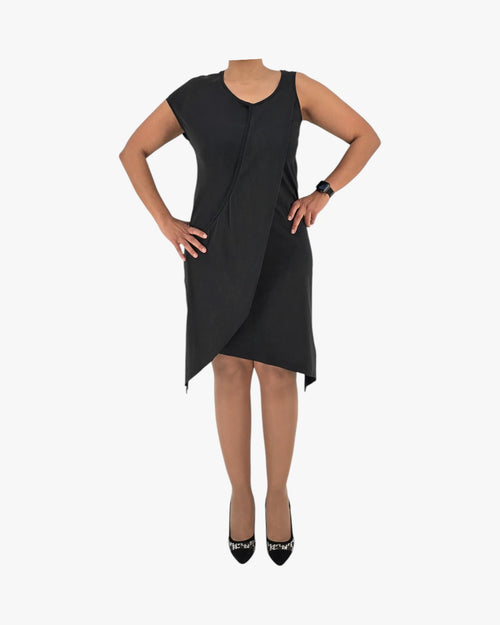 Sleeveless design, asymmetric hemline, soft structured fabric, midi length. Fits medium size.