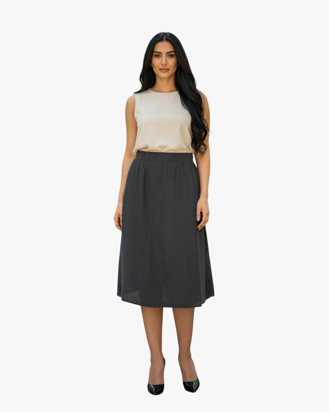 BIS WEAR timeless black midi skirt with a clean, minimalist cut, perfect for understated and versatile styling.