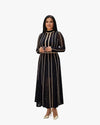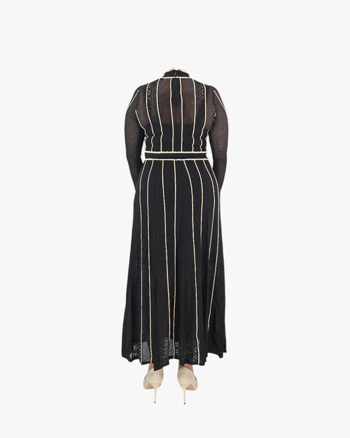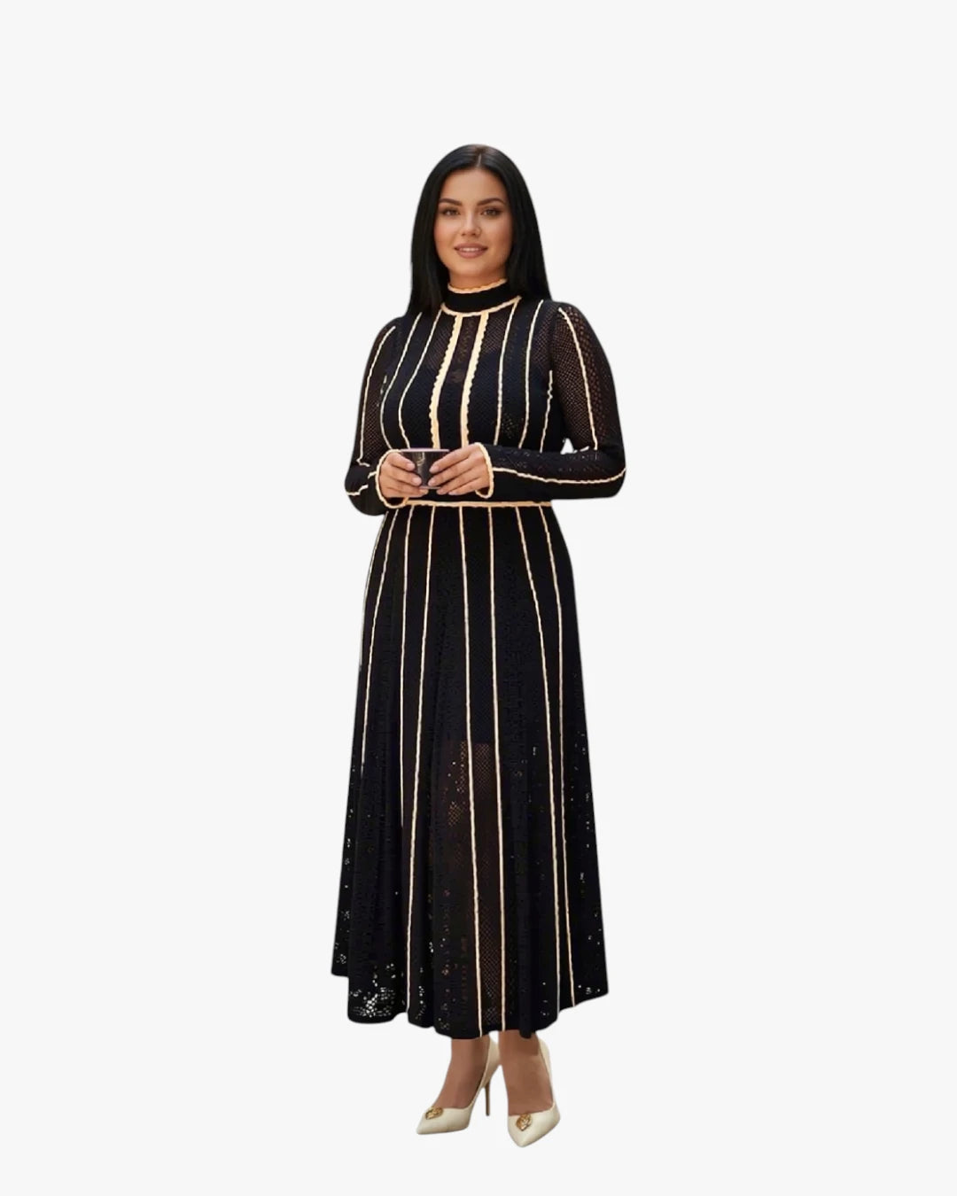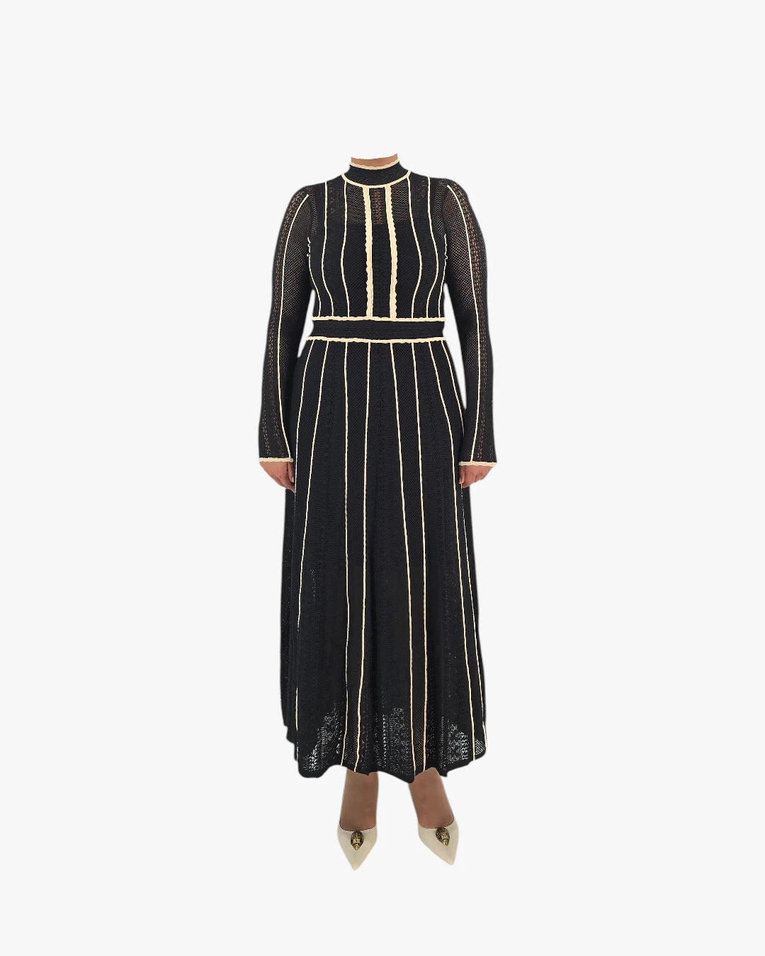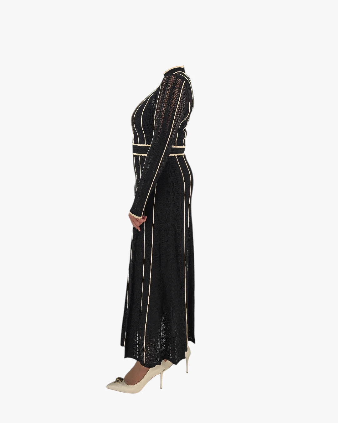 An elegant knit maxi dress defined by vertical lines that elongate the silhouette beautifully. The contrast detailing adds sophistication, making this piece timeless, graceful, and effortlessly powerful.