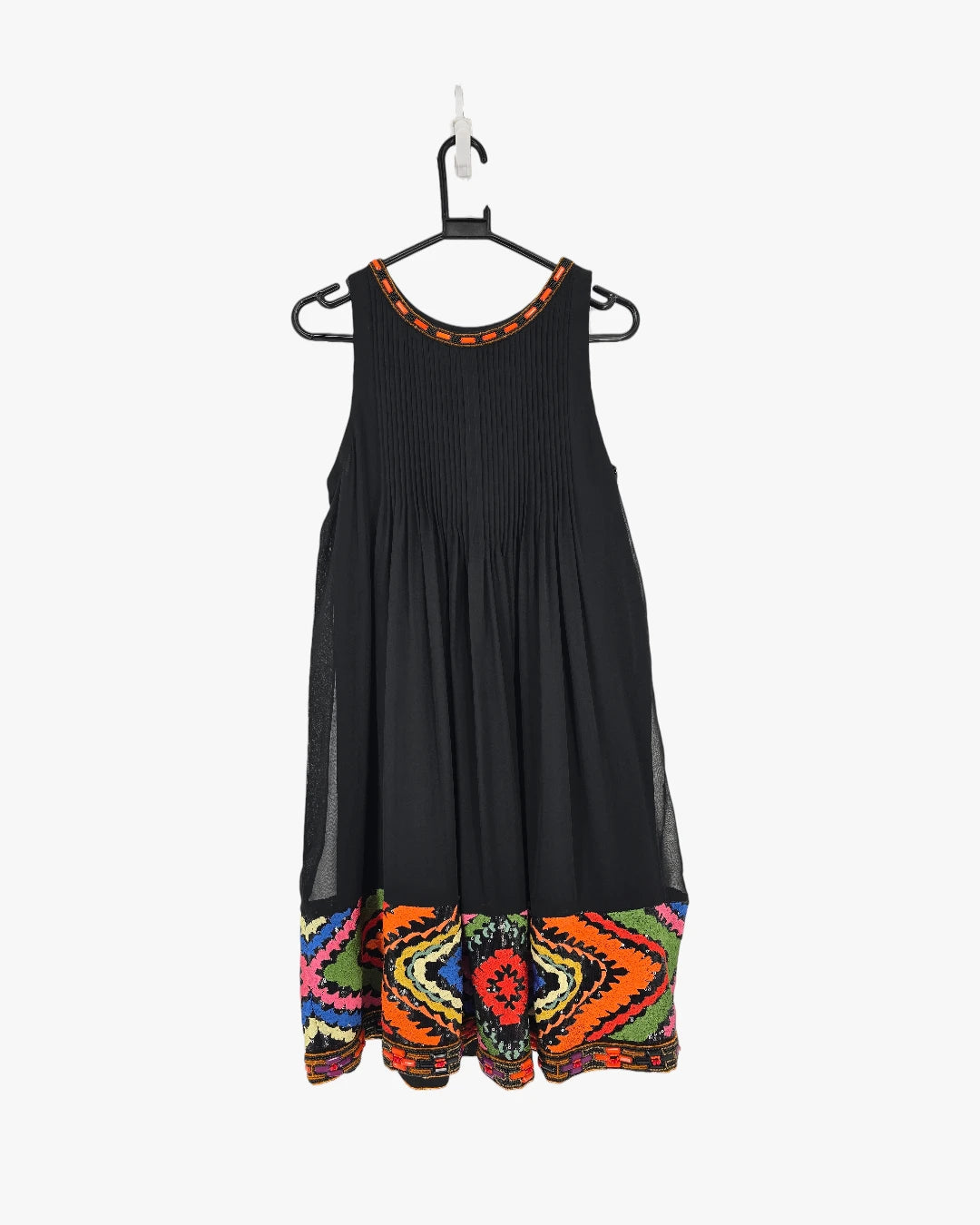 Sleeveless design, pleated bodice, printed colorful hem, midi length, fluid silhouette. Fits medium size.