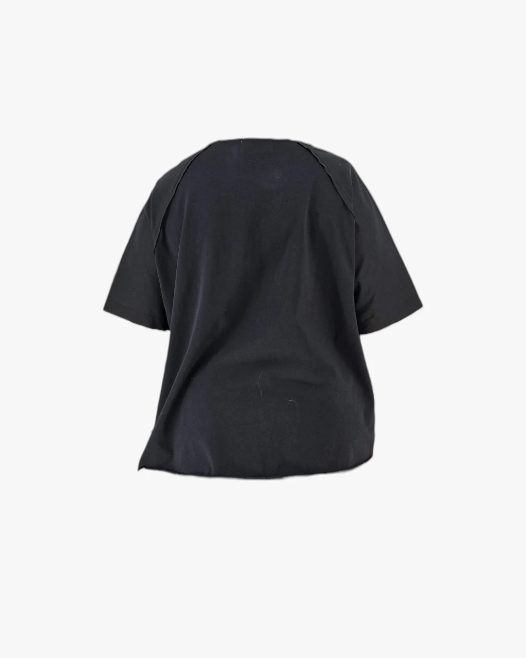 This black short-sleeve top features a simple silhouette with soft structure, making it perfect for layering or wearing on its own. Comfortable and effortlessly stylish. Fits medium size.