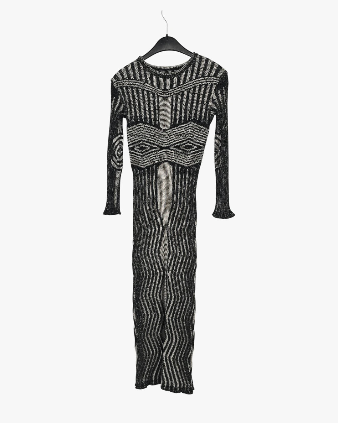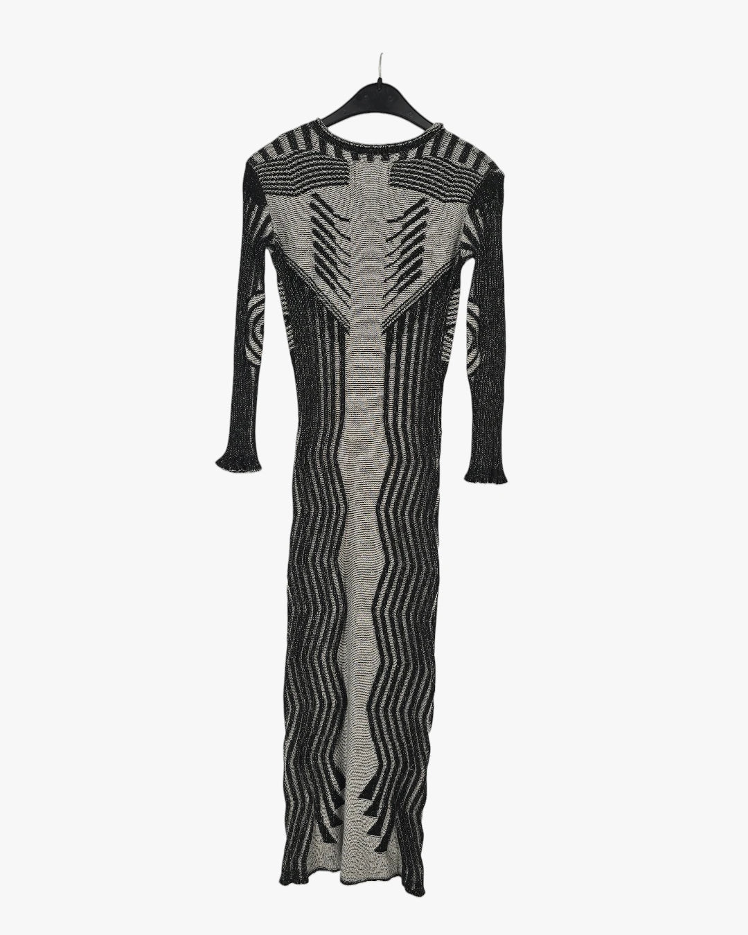 Long sleeves, fitted knit fabric, geometric pattern, maxi length. Fits medium size.