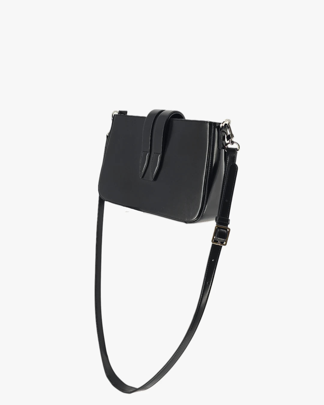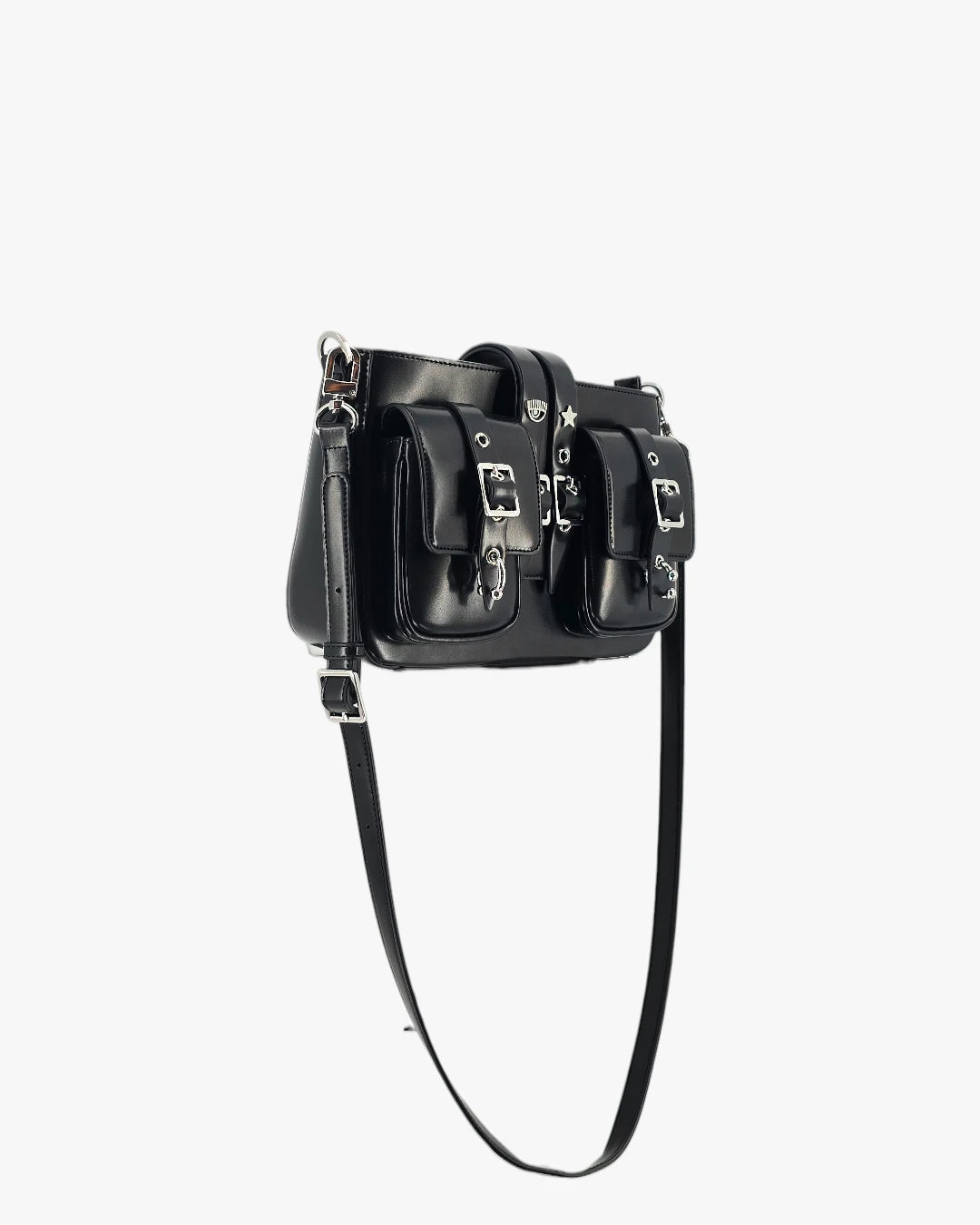 Structured black leather bag with multiple buckle pockets. A bold, utility-inspired design that adds edge to everyday outfits.