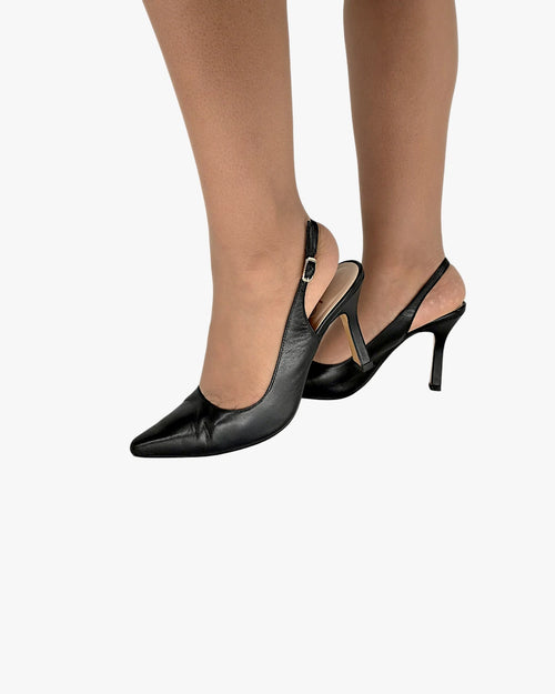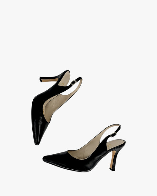 Pointed toe slingback heels, smooth black leather, slim heel, adjustable strap, timeless design. Size 38