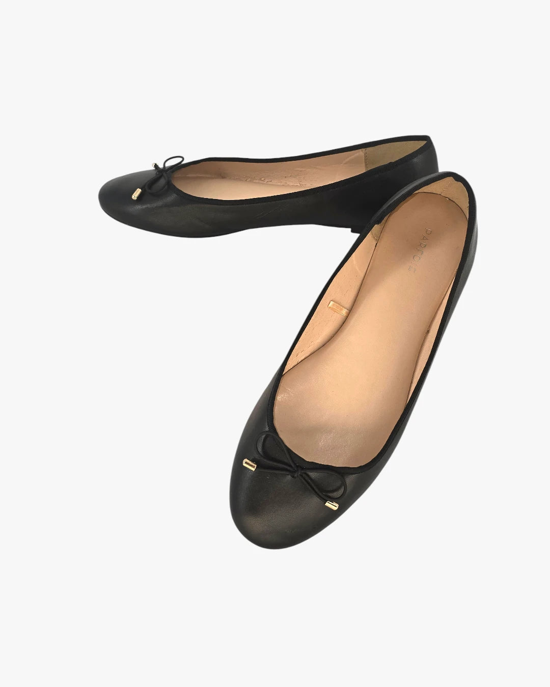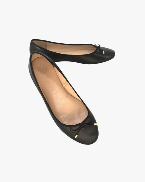 Round-toe ballet flats, smooth leather finish, subtle bow detail, flat sole, elegant and versatile silhouette. Size 38