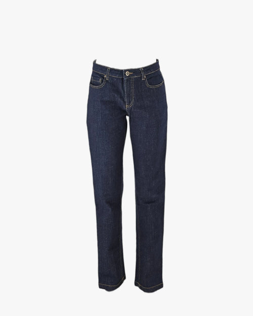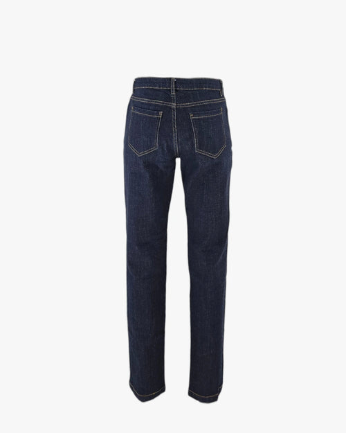 A structured dark blue denim with a refined straight silhouette.