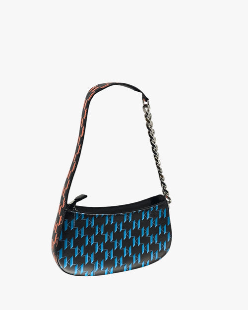 Playful yet edgy shoulder bag from Karl Lagerfeld, featuring a colorful monogram pattern with mixed chain and strap detailing. A bold piece designed to stand out.