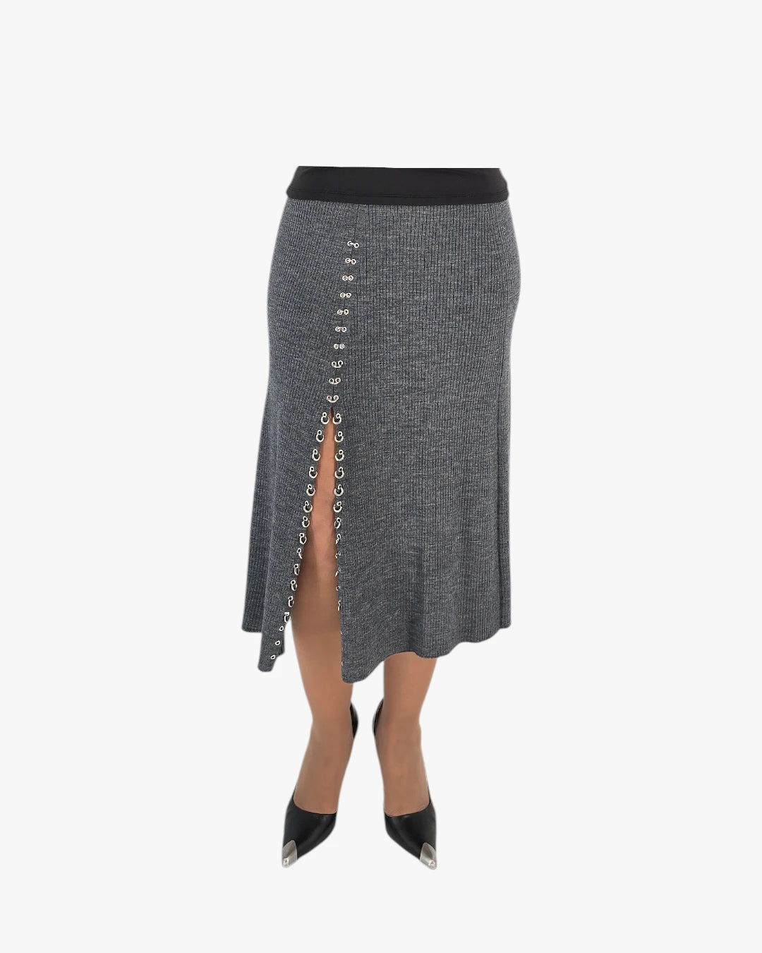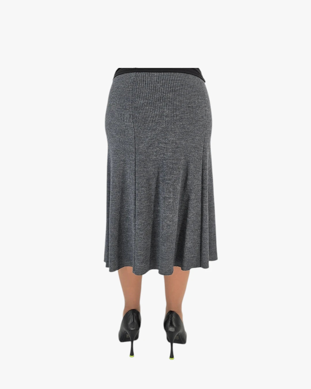 Features a ribbed knit texture with a flattering elastic waistband and a soft, flowing hem that offers structure while maintaining ease of movement. Fits Medium size.
