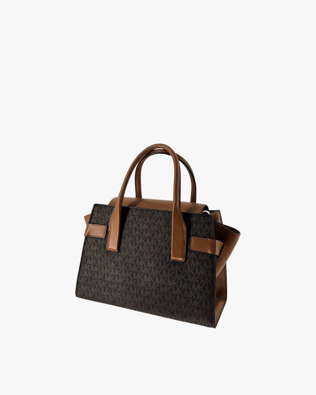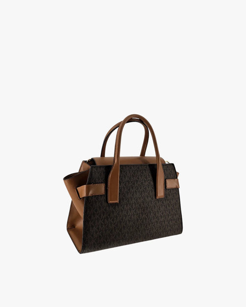 An elegant Michael Kors satchel crafted in the brandÕs signature monogram canvas, finished with smooth tan leather details and a structured silhouette. A timeless everyday bag that balances practicality with classic designer appeal.