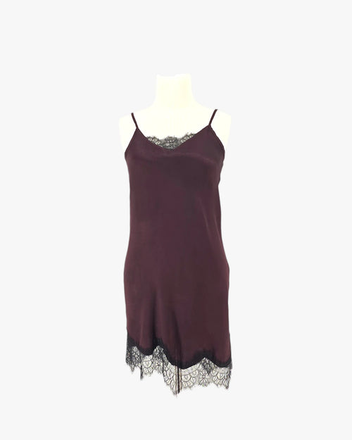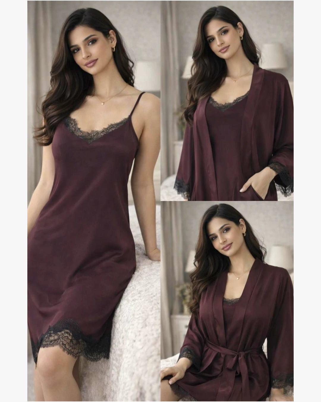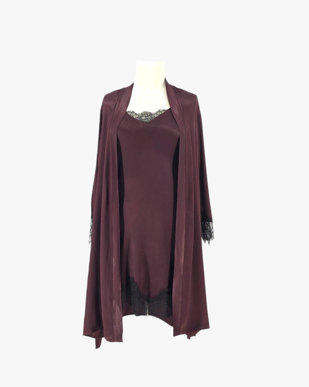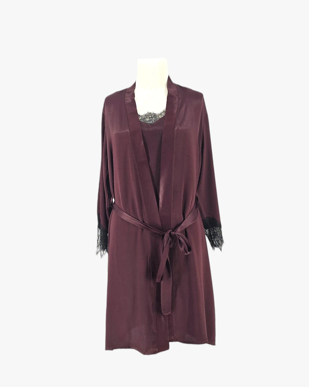 Two-piece sleepwear set featuring an inner slip dress with delicate lace accents and a coordinating wrap robe, fluid, soft, and comfortable with a graceful drape, this item fits medium size