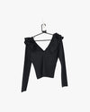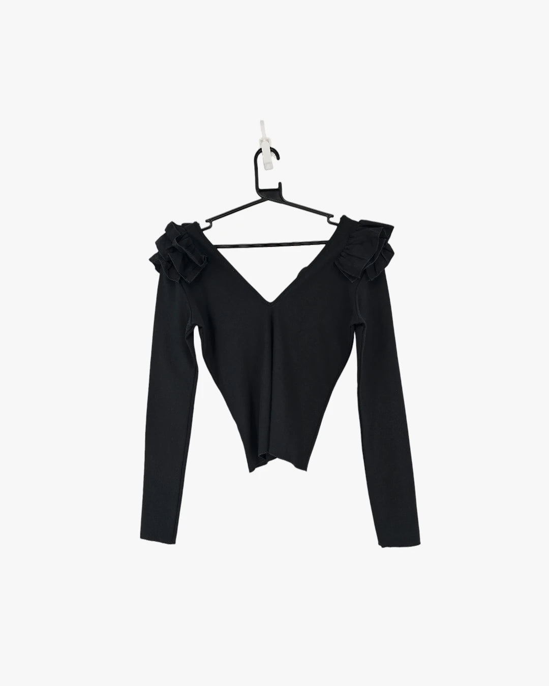 Long-sleeve top featuring a deep V-neckline and delicate ruffle accents on the shoulders, creating a refined yet bold look. Fits medium size.
