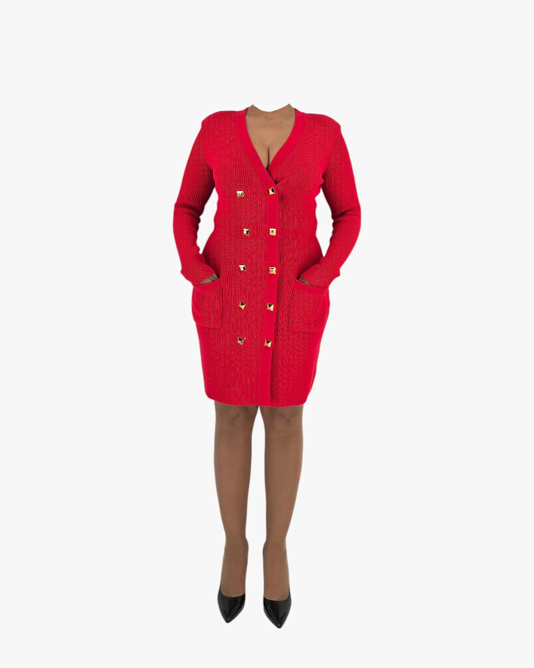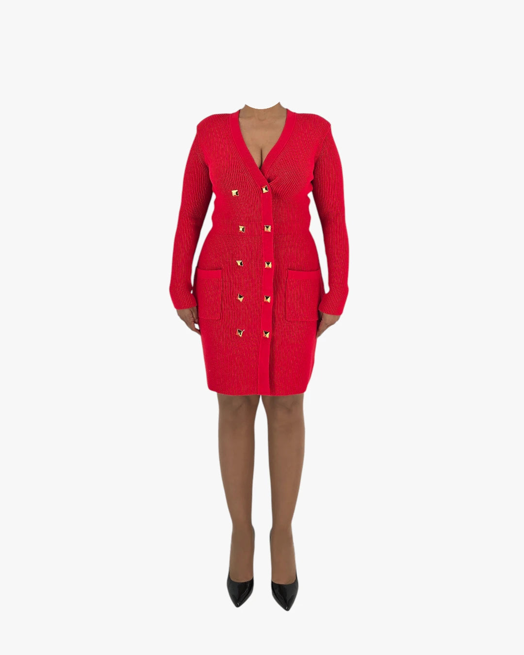 Crafted in a structured knit, this dress features a flattering V-neckline, long sleeves, and signature gold-tone button accents that elevate the design. The fitted cut enhances the waist and follows the body gracefully, while the knee-length hem keeps the look polished and timeless. A standout piece that fits size Medium.