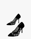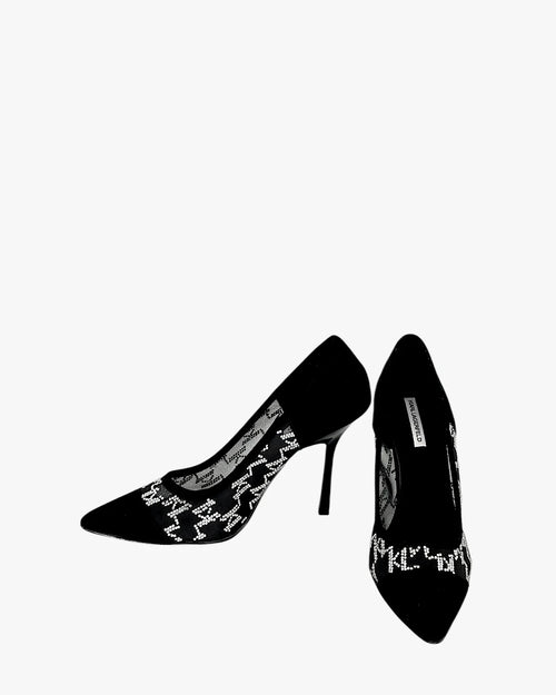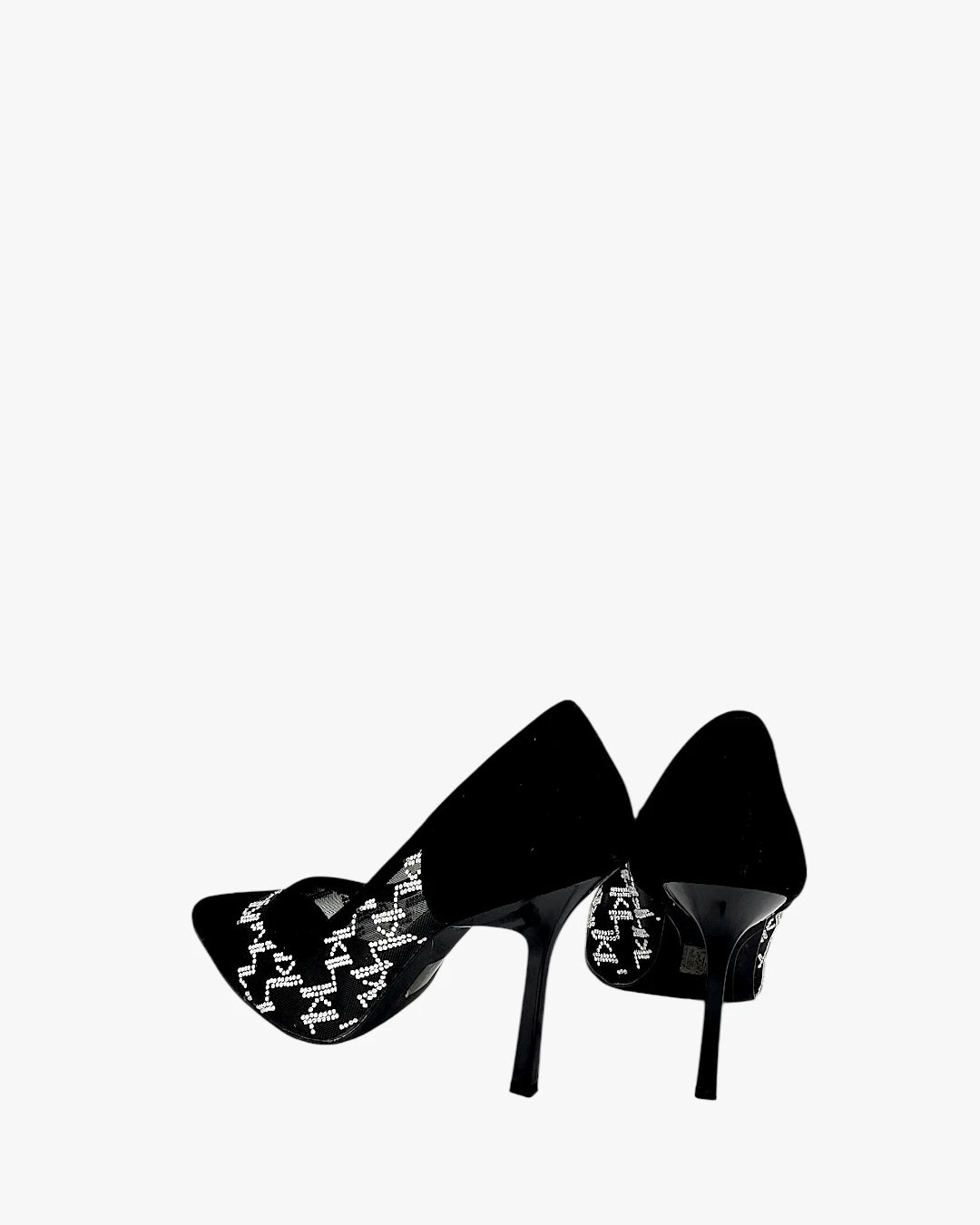 Pointed toe heels, mesh panels with logo detail, slim high heel, black finish, iconic designer style. Size 38