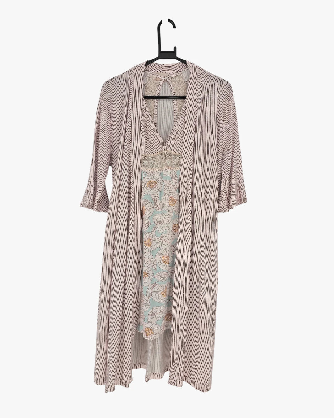 Two-piece sleepwear set featuring a soft slip dress with subtle lace detailing and a lightweight open-front robe, fluid, comfortable, and easy to wear with a relaxed drape, this item fits medium size