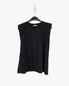 Short-sleeve top featuring structured shoulders and a relaxed fit, easy to dress up or down. Fits medium size.