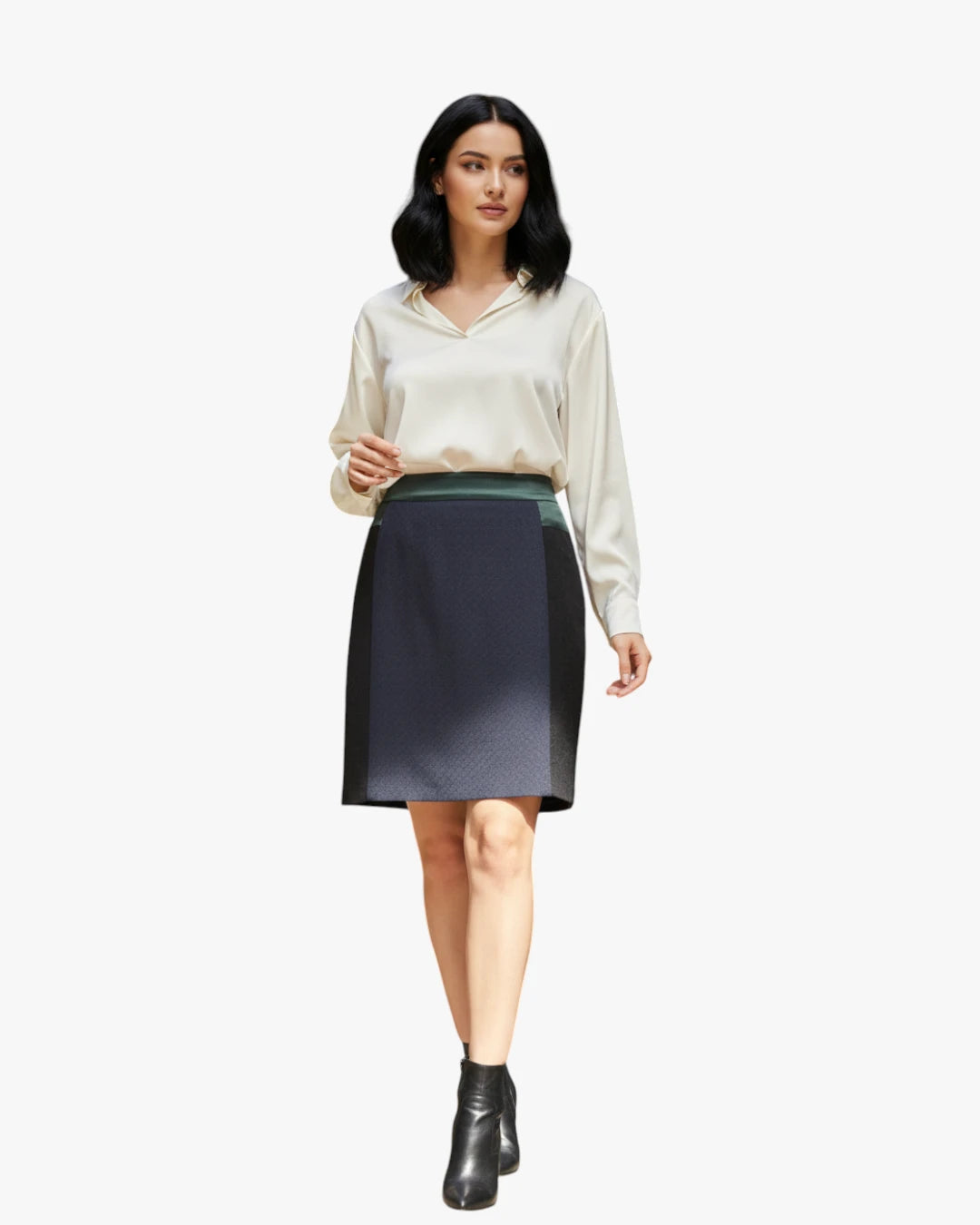 Features a high waist with contrasting panels that create a subtle geometric effect, offering a polished silhouette suitable for work or casual styling. Fits Medium size.